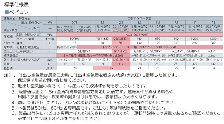 ●仕様 □運転方式・制御方式:自動アンローダ式 □出力(kW):2.2 □圧縮機:最高圧力(制御圧力 ON-OFF)→0.93MPa(0.78-0.93)、吐出し空気量(L/min):265〈281〉 □空気タンク容積(L):80 □電動機 相および電源電圧(V):トップランナーモータ、三相200・220 □空気出口(止め弁出口):G1/4Bx2 □標準装備品:ホース継手(適用ゴムホース呼び径φ6)、止め弁 □外径寸法〈幅X奥行きX高さ〉(mm):1280x365x841 □質量(kg):117 □騒音値(dB[A]):72
