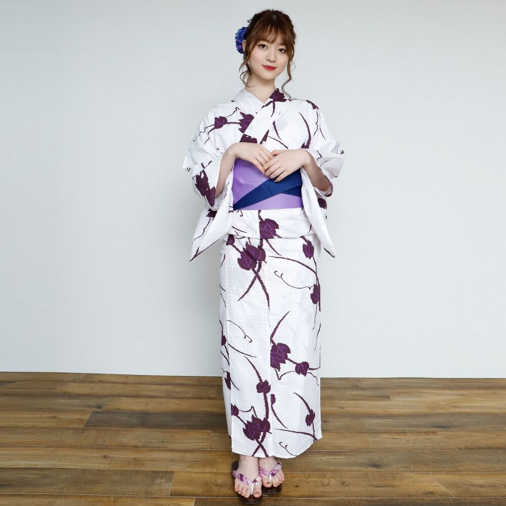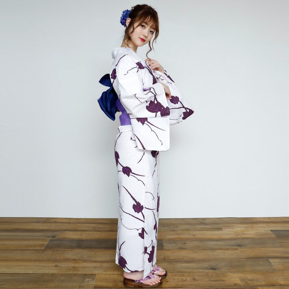 浴衣 レディース 女性浴衣 ゆかた 単品 浴衣単品 レトロ きれいめ オトナ見え 仕立て上がり フリー 葉柄 白 ホワイト パープル 紫 送料無料